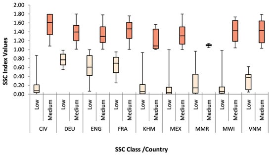 Boxplots of the distribution of the SSC index values for the “low” (yellow boxplots) and “medium” (green boxplots) classes for each country.