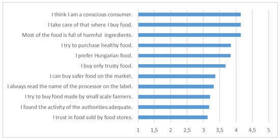 Most of the organic food consumers (60%) is female, 45% of the respondents live in Budapest, in the capital city, 51% graduated and 44% is white-collar worker. These data are in harmony with the results of former surveys also [,]. In that case, 86% of the surveyed consumer have average or higher income levels. The respondents of the survey think in the first place with the same scores that they are conscious consumers, they pay much attention to where they buy food and that the food is full of harmful ingredients. The respondents agreed in that to a great extent. They do not really think that they get safer food on the market but at the same time, they do not trust food traded by food stores (Figure 2).