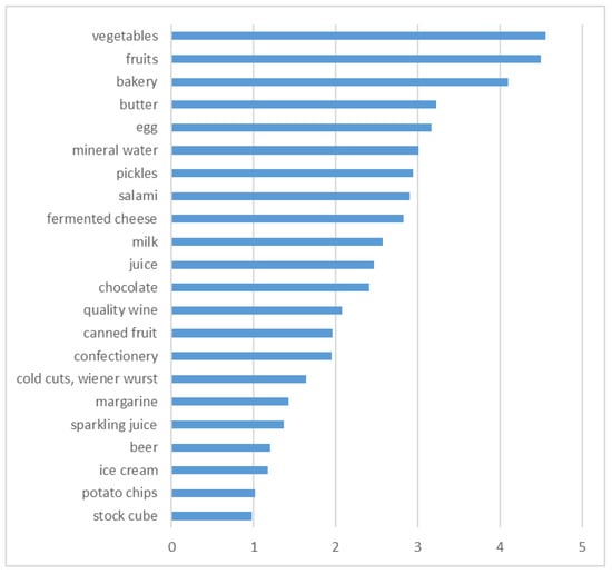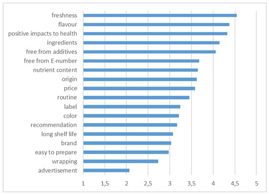 According to the survey, the most important purchase influencing factors are freshness, flavor, and only at the third place positive health impacts. It is interesting to note here that Oroian et al. [] found that the “extrinsic attributes” of the organic products were not considered to be the main reasons for consumers to buy organic products, but it was appreciated due to the important information on the ingredients and nutritional aspects, the factors that influence organic food consumers’ buying behavior. It is important and on the contrary to the average Hungarian consumers’ behavior that the price is not really important for this segment (Figure 3).