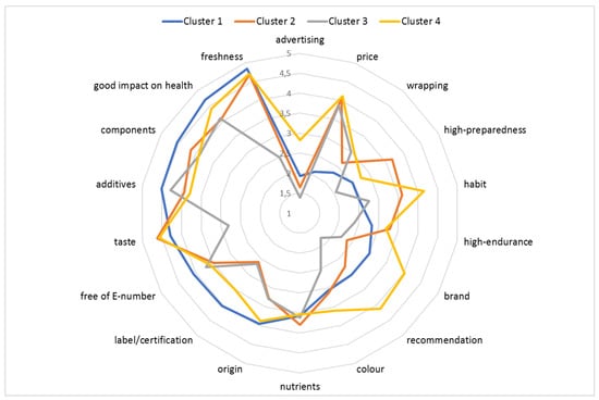 Finally, 4 clusters could be separated according to the abovementioned on the basis of the factor analysis. The most important characteristic of members of Cluster 1 (N = 59) (Figure 6) that the price of organic food influences them to the least extent as compared to the other segments’ members. The freshness and good health impact of food are very important for them. They seem very health-conscious consumers, who are inclined to pay higher prices for quality and healthy food. They try to buy as much healthier food as they can (Health conscious). Freshness and a good impact on health are the most important motives for them. Price and advertisement have the least influence on their purchase decisions. They also try to buy as healthy food as they can and think the food is full of harmful components. As a consequence of this, they select carefully the source of purchase and they do not trust in food sold in food stores and judge poorly the performance of the authority. Freshness, taste, and food components are the most important motives in the second segment of the consumers, Cluster 2 (N = 88) (Figure 6). They chose organic food because they are disappointed by conventional food. They pay much attention to where they buy food and think that food is full of harmful components. These are the most influencing factor in their attitude (Disappointed). Members in Cluster 3 (N = 21) (Figure 6) choose organic food because of its favorable health effect, but they pay attention to the price also. They have a fear of additives, so the most influencing motive for them is that the food should not contain additives (Safe and free food eaters). They do not trust in food sold in the food stores and judge poorly the performance of the authority as the members of Cluster 1.
