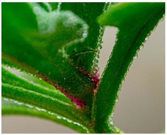 Epidermal bladder cells are external vesicles that have a water and NaCl storage function for osmotic adjustments [22,39,64,65,66,67,68], and betacyanins, flavonoids, myoinositol, pinitol, and transcripts for antifungal proteins, which are related to UV protection and/or pathogen defence [69,70,71,72]. They are present in the leaves, stem, sepals, and buds, but not on the roots, during all stages of ice plant development. When plants are unstressed and in the juvenile phase, epidermal cell bladders remain appressed, but they swell in volume in stressed plants [28]. Three forms of bladder cell develop in mature tissues: the first along the side shoots; the second are the largest and develop in the seed capsules; and the third develop at the tips of leaves and sepals. This indicates that the bladders could be modified trichomes [22].