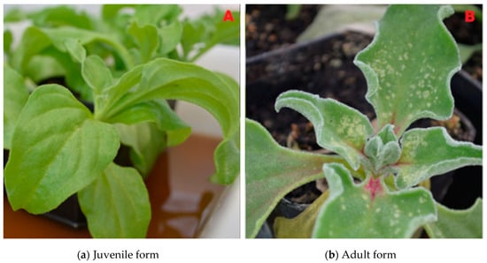 Comparison between juvenile (a) and adult form (b): differences in color, the presence of bladder cells, thickness, and leaf border shape can be observed.