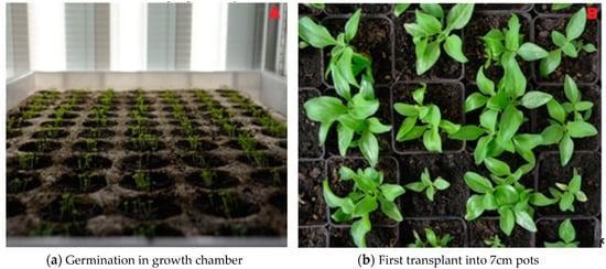 Germination in growth chamber (a) and first transplant into 7cm pots (b).