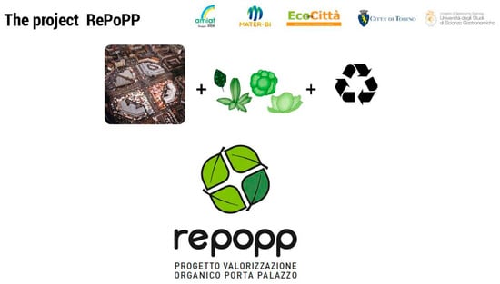 This brief overview of best practices exemplifies the vast panorama of urban food policies that apply the principles of the CE for food to develop integrated, contextualized, and effective policies. Precisely from the analysis of these practices, Turin took the inspiration to develop RePoPP—Progetto valorizzazione organico Porta Palazzo (project for the organic development of Porta Palazzo). This initiative—promoted by the Municipality of Turin, Novamont, the NGO Eco dalle Città, Amiat-Iren Group, with the scientific coordination of the University of Gastronomic Sciences (Project Manager for UNISG: professor Franco Fassio)—is an example of research applied for the design of urban circular policies against food waste (Figure 1).