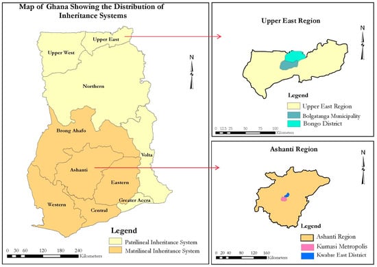 This study is conducted in two regions of Ghana that exhibit classic examples of matrilineal and patrilineal inheritance practices namely, Ashanti and Upper East regions respectively. At the same time, these regions fall under different land governance structures. The Ashanti region has a centralized land governance whereby chiefs hold land in trust and on behalf of their subjects (community members). They exercise political authority and fiduciary control over land. The Upper East region is decentralized and land control devolves from earth priests to clans and families. Historically, chiefs in the Upper East region have had political authority over land while the earth priest performs spiritual (religious) functions over land in terms of allocations, use and transfers [35]. Within each region we selected one urban and one rural district in order to observe the changing forms of inheritance laws as they manifest in different practices. In the Upper East region, we selected Bolgatanga (Urban) and Bongo (rural). In the Ashanti region we selected Kumasi (urban) and Kwabre East (rural). The study areas are shown in Figure 1.