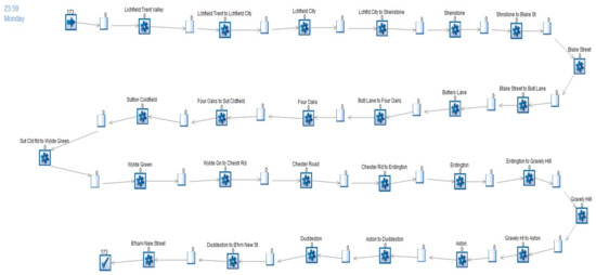 The utilisation levels of the 12 stations in between the terminal stations were observed to be similar. After analysing the obtained results, it is understood that the cross-city line under study is being under-utilised. Some of the reasons might be due to a lesser number of services being run throughout the day, and the other may be due to the operation of services for only 20 h in a 24-h day. It is clear that working during the remaining four hours after midnight is 0%. This can be overcome if the number of services all over the day are increased. However, the services for passengers depends highly on the demand for these services. The demand might be fluctuating and the operators might not want to risk in such a case. Hence, this provides a gap in the system and a potential for alternative opportunities to enhance the utilisation levels of the current system. The evaluation suggests that there is an opportunity in the timetable to increase the number of services. The utilisation levels of the train stations along the line are shallow. The addition of new services can improve the utilisation of stations along the line.