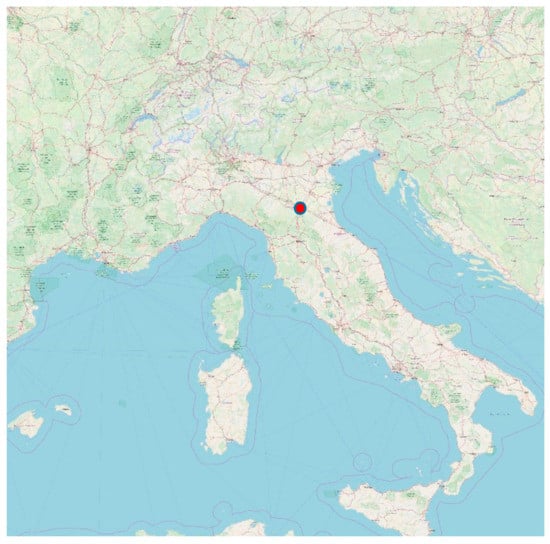 We performed this study in Bologna, a mid-sized northern Italian city with approximately 390,000 inhabitants []; Figure 1 shows the location relative to Italy. As the findings from a study of this nature are impacted by conditions of the built environment, which are localized, we briefly describe general features of this transport context and its cycling environment. The car ownership in Bologna equals 0.515 cars per inhabitant [], which corresponds to 0.97 cars per household, typical other mid-sized Italian cities []. The meters of cycling facilities per resident is 0.330 m/citizen in 2018 [], which is relatively high compared with other medium to large Italian cities. The actual street scene, while deemed chaotic by many thresholds relative to larger cities or cities further south, is manageable for most cyclists. Moderate temperatures (barring August) allow convenient cycling year round and the bicycle commute mode share is equal to 8.0%, therefore higher than the average for Italy. Based on a survey carried out by TNS opinion and social network in the 28 Member States of the European Union between the 11th and 20th of October 2014, the average bicycle mode share was 8.0% [], whereas in Italy the percentage of people who frequently commute by bike was approximately 4.7% in 2017 [].