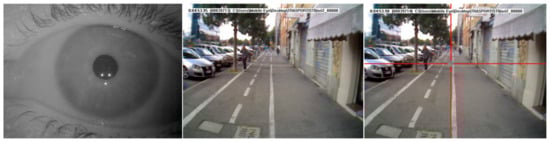 Of the two cameras, one is infrared and records the position of the participants’ right eye pupil and the corneal reflex, and the other records the visual scene in front of them. The ASL software superimposed fixations spots to the cyclist’s visual scene in the form of a red cross with a time resolution of 33 ms (Figure 3).