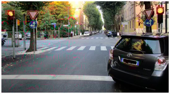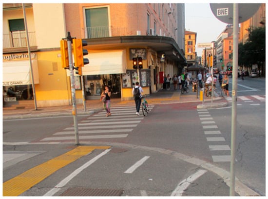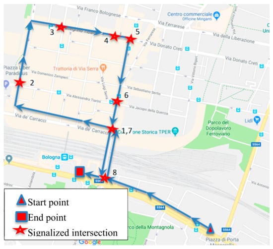 Study participants wore the eye tracking apparatus while cycling and were each prescribed to travel the same three-kilometer course close to the urban center of Bologna. The route was chosen because it traversed different types of cycling environments, including intersections with and without devoted cycling facilities (hereafter referred to as cycle tracks). The travel route defined for the experiment includes different types of cycling environments of the urban area of Bologna for a total length of about 3 kilometers. The route was divided into several segments, one for each type of cycling facility, for a total of seven segments. Four of them are off-road cycling paths, the first two are shared with pedestrians, the third is separated and reserved for cycling and again, the fourth, is shared with pedestrians. The further three segments are on the roadway, because of the absence of any separated cycling facility. The segments offer different pavement quality conditions, different widths, and variable number of signalized and un-signalized intersections. In particular, there were 21 total intersections along the route and our investigation has focused on only eight of them because they are intersections with traffic signals (Figure 4).