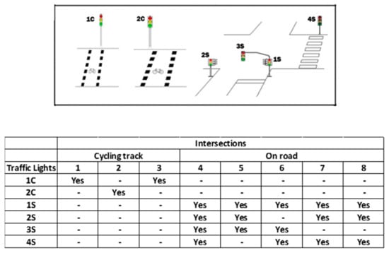 Figure 5 shows the specific type of traffic lights that are present at each intersection type. For ex-ample, only one traffic light is present in 1C and 2C, differing only by its position, on the left versus on the right. In the 1S, 2S, 3S, and 4S cases, a system of lights is present (e.g., intersection 4 includes four traffic lights: 1S, 2S, 3S and 4S). Three of the signalized intersections have cycling tracks on both sides of the crossing; five of the intersections are mixed with motorized traffic. We used this feature to largely differentiate intersection type. Figure 6, Figure 7, and Figure 8 show a street view for three of the intersections examined.