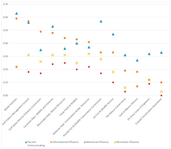 This article examines the presence of trust and its effects on interorganizational influence in a network of organizations implicated in the governance of fisheries in the Gulf of Mexico. The Gulf of Mexico was chosen because it represents one of North American’s most valuable fishery resources, with the recreational and commercial fisheries in the U.S. portion alone amounting to 1.7 million jobs and $212 billion in sales [20]. It is also a complex management challenge because its transnational and interjurisdictional features require that stakeholders coordinate activities and collaborate to ensure shared sustainability outcomes. In the United States, marine fishery regulations are developed by the multi-stakeholder Gulf of Mexico Fishery Management Council (Gulf Council), under the authority of the U.S. Magnuson–Stevens Act. One federal agency (the National Marine Fishery Service—also known as NOAA Fisheries) is tasked with overseeing and approving these regulations, but a host of other federal agencies undertake projects and oversee industries that indirectly impinge on the health of fishery habitat. Within each state’s seaward limit, their wildlife and fishery agencies exercise a high degree of regulatory authority. Their activities are partly organized by the Gulf States Marine Fisheries Commission, whose governance is based on a 1949 compact passed by the U.S. Congress. The Mexican government’s share of the Gulf Coast is nearly as large as the United States’, although its formal status in, and capacity for, coordinated regulatory design and enforcement is comparatively lacking.