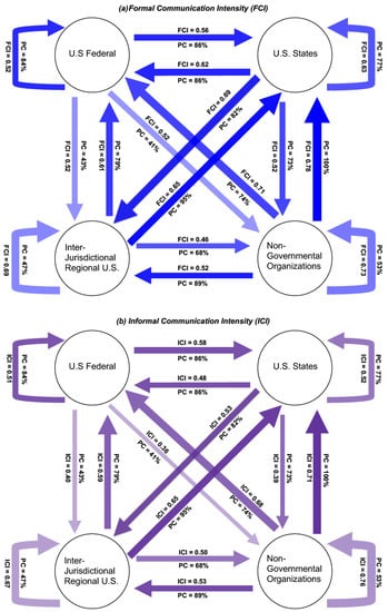 Figure 4 presents the reported interjurisdictional communication patterns in the Gulf of Maine fishery management network, showing: a) the Formal Communication Intensity (FCI); and b) the Informal Communication Intensity (ICI) across jurisdictional categories. The width of the arrows is proportional to the reported level of interjurisdictional communicative intensity, while the percent of respondents from each jurisdictional category communicating with the category to which each arrow points is indicated by a percent communicating (PC) score, also indicated by the darkness of each arrow’s shading. The arrows pointing to the respondent jurisdictional category indicates the reported within-jurisdiction interagency communication (for example, between different federal agencies).
