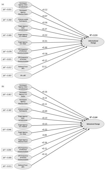 Figure 6b (and Table A2 in the Appendix A) presents the significant results of the hierarchical regression predicting the impact of trust and formal and informal communication to bring about influence defined as behavioral change. After controlling for participant organization type, dispositional trust, and target jurisdiction, three independent variables had a significant effect on moderate interorganizational influence. As for informational influence, both formal and informal communication frequency predicted behavioral influence, with informal exhibiting a larger effect than formal communication. However, here, the effect of informal communication is stronger than for informational influence, and the effect of formal communication is weaker. Rational trust impacts behavioral influence, but its effect is weaker than it is for informational influence.
