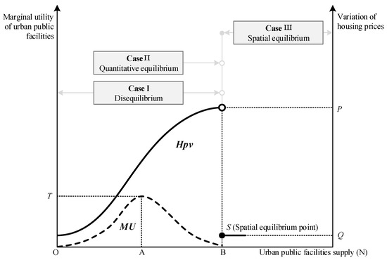 In case I, the supply quantity of some scarce and high-quality public facilities will never meet people’s needs. It is because the service population and service radius of such facilities are limited, and the balance of quantity and spatial distribution of such facilities will not be achieved, which can be called “disequilibrium”. The variation of housing prices caused by such facilities is shown in Formula (5) (assuming there are no tax differences).