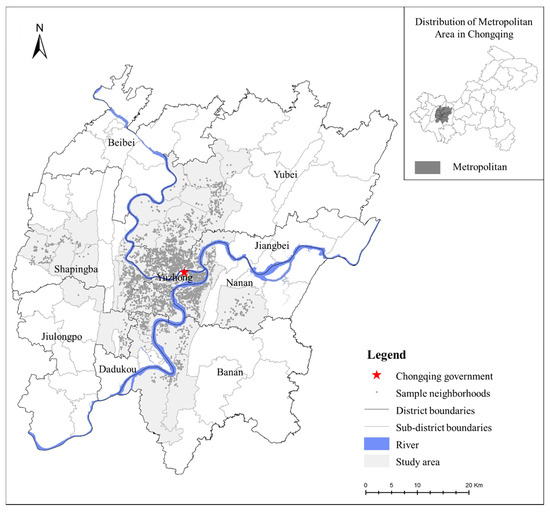 Chongqing is the only municipality in Western China, and is one of most important central cities in China, as well as the economic, financial, science and technology centre in the upper reaches of the Yangtze River. The main urban area in Chongqing is the political, economic and cultural centre of the entire municipality. Its urbanization is developing fast (89.83% in 2017) and its economy has rapidly developed recently. Thus, the main urban area in Chongqing is a good sample of growing cities in China. The current study selects the metropolitan area of the main urban area planned in the Chongqing Urban and Rural Master Plan (2007–2020) as the research area, including all districts of Yuzhong, Dadukou, Jiangbei, Nan’an, Shapingba, Jiulongpo and areas of Yubei, Beibei and Ba’nan.
