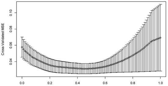 For the LASSO estimation of parameter t, Efron et al. [53] proposed a cross-validation (CV) method. CV divides the sample data into K parts and sequentially uses the kth () part as a test sample to calculate the CV residual, and the remaining K − 1 part is used to fit the model as a training sample, which is often with K = 10. Under these constraints, CV determines the most suitable tuning parameter t, thus obtaining the solution path of each coefficient and the corresponding solution value. The regularisation parameter is defined as . The prediction error estimated by the value of s on the interval (0,1) through CV is minimised by selecting . The s corresponding to the minimum CV is the final determined parameter.