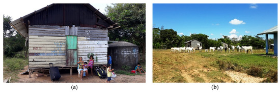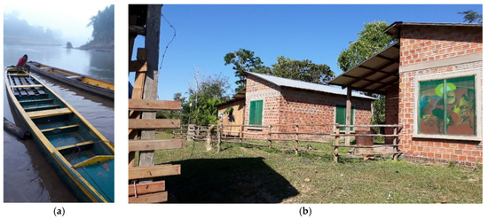 (a) A Yaminahua mother and her five children waiting in San Miguel de Machineri for land transport to Cobija, the closest big city in Bolivia, some 80 km away. The Machineri community showed evidence of water storage systems and solar panel and communication systems. (b) It was again evident that the original landscape of vernacular architecture and natural biodiversity has been replaced by brick and mortar constructions and the presence of big and small cattle for food security.