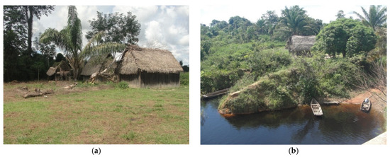 In 1973, before returning to the United States, the Maryknoll order sold some land to Cavineños individuals, though their rights as landholders were not, at the time, recognized by the church nor the government. Nevertheless, the Cavineños prospered and they continue to base their livelihood on the practices of agriculture, hunting, fishing, and gathering [64,90]. They also maintain practices of traditional medicine along with modern medicine [65,90]. They have particularly developed their agriculture in riparian zones, putting in practice slash and burn techniques to cultivate corn, rice, sweet potato, walusa potato, yucca, banana, peanut, watermelon, and tomatoes [90]. They have also learned skills for rubber extraction (from the time of the Barracas), and the harvest of Brazil nuts (from the time of the missions) (Figure 7) [64,65].