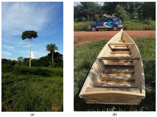 (a) A Brazil nut tree standing among the rest of the forest. Brazil nut exports represent part of the 2.3% of the national Bolivian GDP as a forest-friendly sustainable economy [98]. (b) However, a road system, which is part of the Corredor Norte’s central government development plan, is being connected to the Brazil–Peru inter-oceanic highway. Although it is still a dirt road at the time of writing, it is likely to become a busy, metaled road supplanting the canoe as the chief means of transport and facilitating the driving forces of deforestation.