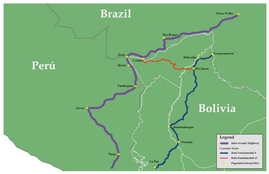 The Interoceanic Highway route (shown in purple) connects productive towns in Brazil (Portobello, and Assis), Bolivia (Cobija), and Peru (Iberia and Tambopata). Shown in blue; the North Corridor connecting the city of La Paz to the Northeast Amazon cities of Riberalta and the border city of Guayaramerín with Brazil (Beni). Shown in red; the branch road from El Chorro (Beni) to Cobija (Pando) [105,107,109,110].
