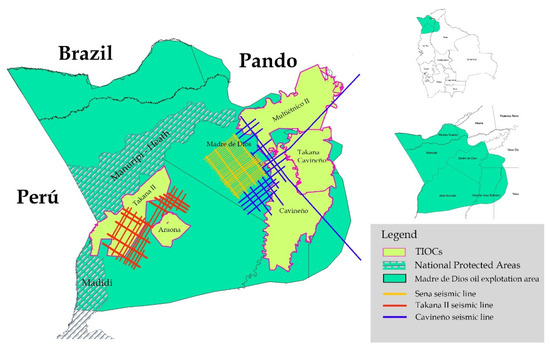 According to Colque and Paniagua (2019), the oil exploration area called Madre de Dios, is part of a central government plan to intensify the oil exploration and exploitation on the west part of the Bolivian northern amazon. Orange, red, and blue colored grids represent overlapping seismic lines on protected areas and TIOCs. Both TIOCs, the Yaminahua–Machineri and the Takana–Cavineño will be affected [97].