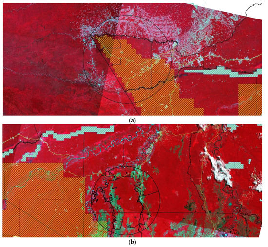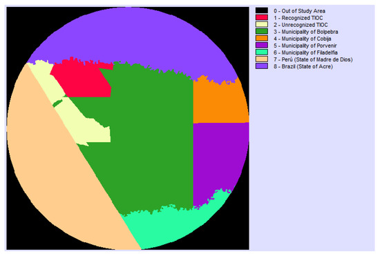 For both TIOC case-studies, a study area was considered in the analysis within a certain circular radius to obtain a 360-degree view approximation of the potential land use change from all directions. For the Yaminahua–Machineri, the officially and not-officially recognized territories comprised the total polygons of the TIOC, and the contiguous surrounding areas constituted the overall study area. Overall, eight zones were encompassed within a 45.5 km radius from a geographic center at the municipality of Bolpebra. The study area includes, to the north, the Brazilian state of Acre, to the west the Peruvian state of Madre de Dios, to the east, the Bolivian municipalities of Bolpebra, Cobija, and Porvenir, and to the south, the Bolivian municipality of Filadelfia (and the extensive Bolpebra) (Figure 10).