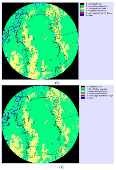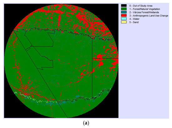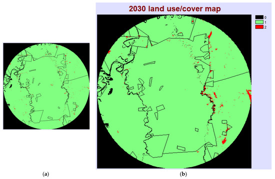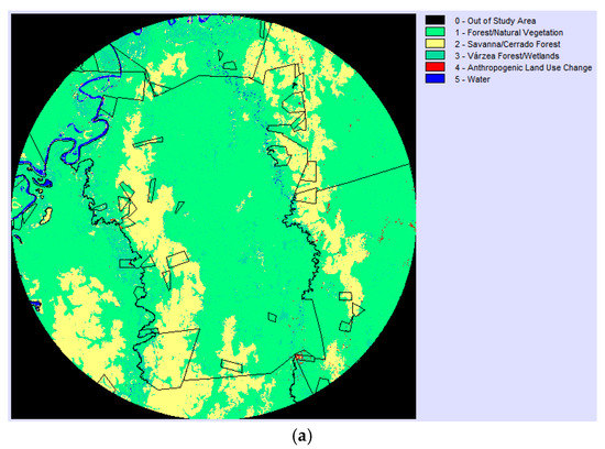 Then, for the extrapolation of non-indigenous anthropogenic Land Use Change (LUC) to the year 2030, the geographical modeler GEOMOD was used, considering estimated deforestation rates from the previous step. GEOMOD was developed by research scientists at the State University of New York, college of Environmental Sciences and Forestry (SUNY–ESF, Syracuse, NY, USA), and is currently available in the GIS software TerrSET developed by Clark Laboratories at Clark University [53,55,67,68]. GEOMOD is a versatile modeler predictor of land use change that has been used for various topics including: the assessment of ecosystem services in the Philippines [69] and China [70]; predicting urban expansion in different countries such as Iran [71,72], Palestine [73], and Puerto Rico [74]; deforestation projections in the Mediterranean [75], India [76,77,78], Chile [79], Mexico [80], Costa Rica [53], and Papua New Guinea [81]; and for the estimation of carbon baselines for REDD (Reducing Emissions from Deforestation and Forest Degradation) projects [54,56,82] around the world, including Panama [83], Indonesia [51,84], Belize, Brazil, and Bolivia [55].