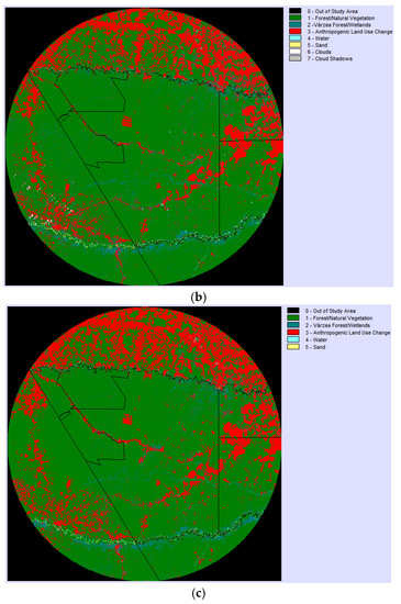 In order to determine deforestation rates in indigenous managed territories and other types of native-community land management, satellite multi-temporal analysis of different land cover was conducted for both TIOCs and their correspondent reference area. A more detail description of the remote sensing procedures can be found in Section 2.4, but with reference to accuracy and reliability, following the recommendations of Li and Eastman (2006), an artificial neural network classifier called SOM (Self-Organizing Map) was used, because it can perform with 1.4–3.3% more accuracy than other standard classifiers such as the Maximum Likelihood that was used by Bottazzi and Dao (2013) [66].