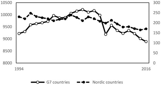 Figure 1 shows the trend of carbon dioxide emissions in G7 countries from 1994 to 2016. From Figure 1, we can see that the average annual carbon emissions of G7 countries are over 90 billion tons, and the total carbon emissions reached the peak in 2005. The total carbon emissions of G7 countries decreased sharply in 2009. In recent years, the total carbon emissions have shown a downward trend. Although the total carbon emissions of G7 countries have decreased in recent years, according to the BP World Energy Statistics Yearbook, the total carbon emissions of G7 countries still account for more than 40% of the total world carbon emissions and play an important role in the total world carbon emissions [6]. The average annual carbon emissions of the four Nordic countries are more than 20 billion tons. The total carbon emissions of the four Nordic countries showed a downward trend of fluctuation. According to the BP World Energy Statistics Yearbook, the total carbon emissions of the four Nordic countries account for about 0.96% of the total world carbon emissions [6]. Therefore, this paper selects these two major economies as research objects that are very representative.