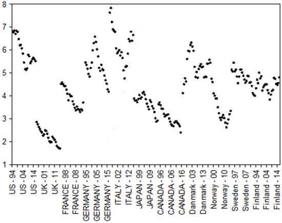 From the descriptive statistics in Table 1, we can see that the average level of energy tax in the four Nordic countries and the G7 countries is greater than 4%. The proportion of energy tax in the four Nordic countries is slightly higher than that in the G7 countries and the Nordic environmental tax collection is generally stronger. However, there is a large polarization in general, especially in G7 countries; the difference between the maximum and minimum of energy tax ratio can reach 6%. Further observations show that among the indicators reflecting the green dividend, in the proportion of fossil fuel combustion the average level of G7 countries (close to 80%) is much higher than that of the four Nordic countries (less than 60%). In addition, among the indicators reflecting the blue dividend, the average proportion of distorted taxes in the G7 countries is also higher than that in the four Nordic countries.