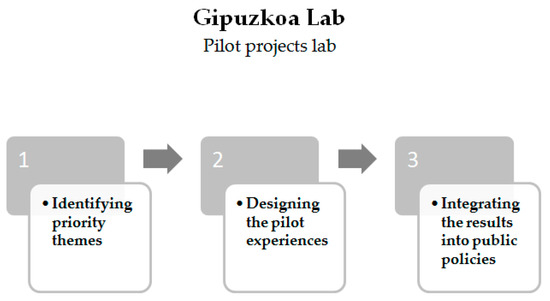 The Gipuzkoa Lab represents the materialisation of these actions and, therefore, the core of the participation strategy and Etorkizuna Eraikiz program. According to the report “Experimentation methodology of Gipuzkoa Lab” [49], the public policy laboratory at the Gipuzkoa Lab seeks to promote a prospective exercise to build public policies related to challenges in the medium term. The Gipuzkoa Lab was born with the aim of transforming organizations and companies into “laboratories” to test economic, social and cultural policies. In this sense, the innovation processes that take place in the public policy laboratory happen through pilot projects (developing in Gipuzkoa Lab) applying and sharing experiences with the territory and drawing conclusions about unsuccessful experiments.