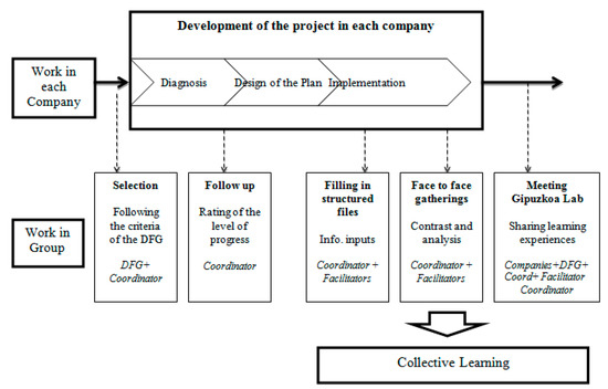 This project is based on a qualitative methodology using two processes (see Figure 2). First, in the diagnostic process, questionnaires were used to analyse the situation of worker participation based on different tools developed by consulting firms. The questionnaires were completed by the entire staff, workers or specific group (mainly the management team). Studies, publications and other materials were used in this field (e.g., contents available on the Gipuzkoa Participation website), workshops and training sessions. These tools allowed an in-depth analysis of the situations related to worker participation in the companies and the identification of lines of action to reinforce the participation model.