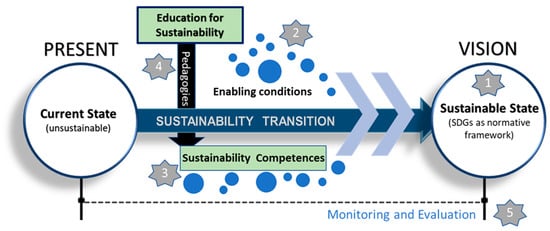 Educational framework for sustainability transformation and main steps: (1) A participatory vision of sustainability, (2) enabling conditions for sustainability, (3) competences for sustainability transformation, (4) pedagogies and learning strategies for Education for Sustainable Development (ESD), and (5) monitoring and evaluation of ESD competences and distance from sustainable state. Adapted from [1].