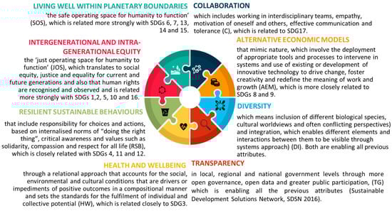 “Generating a desirable future, and then looking backwards from that future to the present in order to strategize and to plan how it could be achieved”, often termed as back casting, is considered best practice in long-term planning for sustainability transitions [50]. Back casting, which is the methodology that binds all the steps of our framework, begins with a projection of the desired outcome(s), and works backwards to understand what is needed for their realisation. In an educational environment, this process could be used to relate educational outcomes to the enabling conditions for the localised vision of sustainability to emerge. Example of enabling conditions for a vision of sustainability related to the SDGs is shown in Figure 3. This has been constructed by grouping the SDGs into major systemic attributes and enabling conditions. Those related to achieving the safe operating space refer to maintaining ecological integrity and not transgressing crucial planetary boundaries conditions [51]. Those related to achieving the just operating space [52] include the social foundation of justice, equity and equality for all, now and in the future (intergenerational dimension), under conditions empowering them to lead fulfilling lives. Finally, transparency, responsible governance, health and wellbeing, diversity, resilient sustainable behaviours, and partnerships between many actors of civic society that can lead to innovation, are also needed. A localised vision of the SDGs would also require an economy that is not short-sighted, if to ensure that humanity operates within the safe and just space and thus to promote natural and human wellbeing.