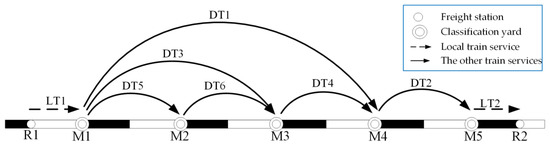 Figure 1, there are shipments to be delivered from freight station R1 to freight station R2. Firstly, the shipments will be delivered to classification yard M1 (M refers to the classification yard) by local train service LT1, and then be transported to the destination according to the blocking plan. There are three strategies in total.