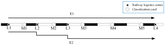 Figure 2; E1 and E2 refer to express train service), which will be classified in the railway logistics center, and then be directly shipped to L4 through E1. When the shipments of L1 (L1, L2, L3 and L4 refer to railway logistics centers) are too small to be delivered by a whole train, then the train departing from L1 will pick up some shipment cars in L2 and L3 and then be delivered to L4 directly (see E2 in