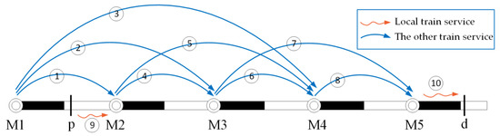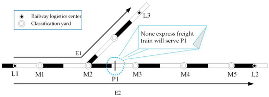 Traditionally, the high value-added shipments in the regions without express train services are usually delivered by the local train to the adjacent classification yard, and then they are delivered to the destination station according to the freight blocking plan of the railway company. Assuming that there are high value-added shipments from logistics station p to destination station d (see