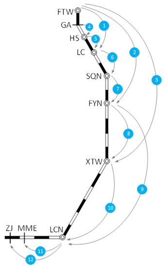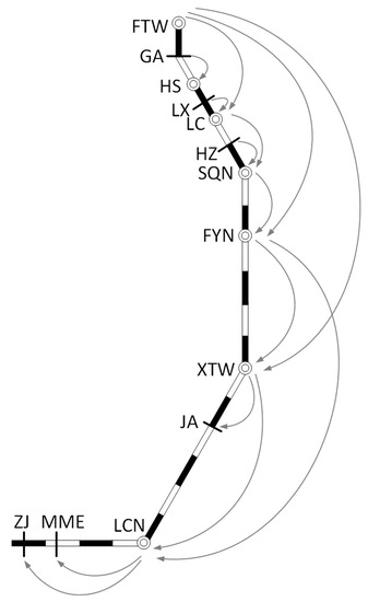 The constraints in Equations (22) – (24) ensure that the high value-added shipments can be sent to the corresponding terminals. Equation (22) indicates that the high value-added shipments cars at station can only be served by one train; Equation (23) ensures the flow balance of the stations; Equation (24) ensures that the freight cars of are delivered to the terminal station by only one train. The constraints in Equation (25) are bounded by the predefined due date. If Equation (25) is not satisfied, it is overdue for the high value-added shipments, then the corresponding scheme shall not be adopted. In fact, the cars with high value-added shipments cannot meet the direct train when they arrive at classification yard but often need to wait for a period of time. We take the average waiting time as at classification yard , and similarly in and in . Equation (26) presents 0–1 variables constraints.