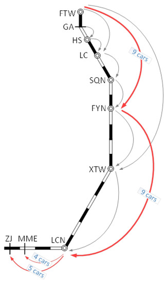 There are two situations according to the train services selected by cars in the departing stage.