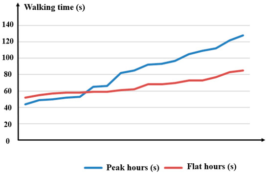To highlight the microscopic behavior characteristics of pedestrians under massive passenger flow, taking the pedestrian behavior characteristics during peak hours and flat hours as comparison. Taking the data analysis of the pedestrian tracking survey of line three and line two of Xiaozhai metro station as an example, the walking time of different samples in flat hours and peak hours was calculated and sorted according to the time consumption. The recorded walking time was the time after deducting the behavior unrelated to wayfinding performance (phone, chat with friends, etc.). As shown in Figure 2, the walking time of different pedestrians during flat hours is relatively balanced, while the walking time of different pedestrians during peak hours varies greatly. The appearance of the intersection in the figure indicates that walking speed during crowded peak hours even exceed the speed during flat hours. The reason for this phenomenon might be explained as, during flat hours, (a) the pedestrian can move forward at their corresponding desired speed due to the low crowd density in the station, and (b) they receive relative low disturbance from the surrounding crowd. However, pedestrians would receive much higher disturbance from the surrounding crowd because of high crowd density in the station during peak hours. Some of them would surpass others due to different travel purposes, time value perception and emotions that want to leave the crowded environment as soon as possible, etc. Therefore, some pedestrians’ walking time during peak hours is less than that during flat hours.