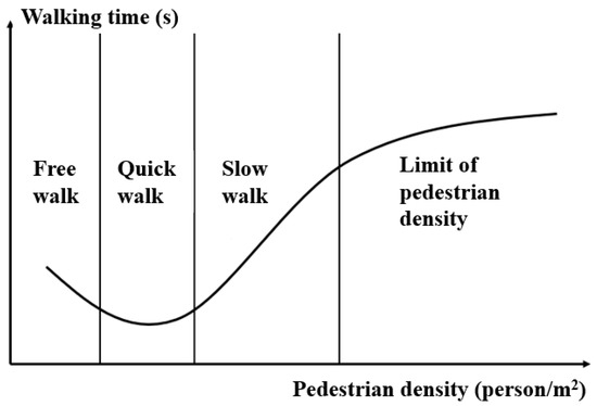 The relationship between walking time and crowd density is shown in Figure 3. In general, the walking time showed a trend of decreasing first and then increasing with crowd density. As the pedestrians can walk at their desired speed, obvious individual characteristics and short walking time were observed among pedestrians under low crowd density. With increase of crowd density, pedestrians in front will speed up to avoid being surpassed under the pressure of the pedestrians behind, and pedestrians behind will follow up quickly and surpass the pedestrians in front if possible. At this time, the walking speed of the pedestrians increases significantly and the walking time is the shortest. When the crowd density reaches its limit, the walking speed of pedestrians decreases obviously due to space restriction, at which time the individual characteristics of pedestrians faded and passenger flow characteristics magnified.