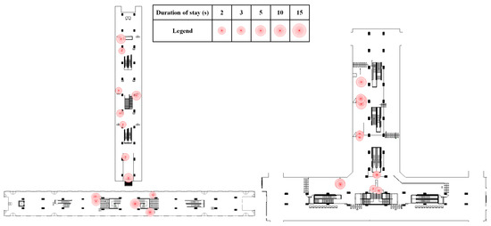 According the statistics of pedestrian behavior recorded by experimenters, the duration of stay at different locations of the station are illustrated in Figure 4. Detailed analysis of micro-behavior characteristics of pedestrians is provided in the next section.