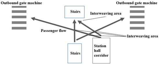 The passenger flow lines in the station hall are complex because of multiple conflict points and confluence points, as shown in Figure 5. It is found that in the station hall without iron horse isolation, pedestrians with the same travel purpose have self-organization behavior, and passenger flow is automatically separated under the guidance of guiding signs. The phenomenon of self-organization of pedestrians is owing to the herding behavior, reflected by following the pedestrians in front. With the increase of the conflict points of pedestrian streamline and the increase of the passenger flow during rush hours, the pedestrian speed would decrease dramatically.