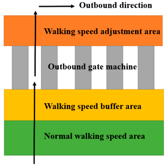 By comparing the pedestrian behavior in each area of the station, it is found that the pedestrian speed is lowest when passing through the gate machine area. walking space is limited and walking speed decreases dramatically in this area. In addition, the stop duration in this area is various according to individual conditions (age, degree of familiarity with gate machine, whether carrying luggage, etc.). The changing process of walking speed around the outbound gate machine area can be divided to normal walking area, walking speed buffer area (slow down), walking speed adjustment area (speed up), as shown in Figure 6.