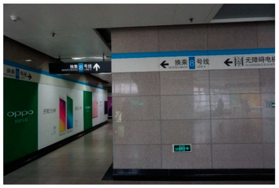 In exit direction, alighting passengers prefer the nearest stair to exit or transfer. A guidance sign containing exit information, transfer information, direction indication, and emergency exit indication should be set on this streamline. Suspension is preferred in the setting form, as shown in Figure 8.