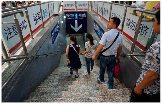 However, the importance of linking reasonable setting of guiding sign and behavioral characteristics of pedestrians was not realized by researchers until recently [18]. The main stream of this research studied behavioral characteristics of pedestrians under context of assumed evacuation scenarios in metro stations [19,20,21,22], while for administrators of metro operation and citizens using metro services, the key point should be assurance of efficient pedestrian flow in metro stations under normal situations for most of the time. Moreover, the psychology and behavioral intention of passengers in metro stations are quite different under context of normal operation compared to emergency evacuation [23,24,25]. Therefore, the viability and applicability of research results under assumed emergency evacuation situations cannot be directly applied to massive passenger flow under normal situations, evoking the necessity of research on guiding sign setting for metro users under normal operation. To the best of the authors’ knowledge, no relevant study has been performed to date to explore the setting of guiding signs from perspectives of practical pedestrian behavior needs and pedestrian cognition. Actual needs of pedestrians reflected by the micro-behavior of pedestrians in the actual environment were ignored, which would limit practical application.