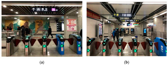 Pedestrians have the behavior characteristics of slowing down in front of the gate. Long queues can form during rush hours. The main contributors of deceleration or stagnation are passengers who are not familiar with the station. Aiming to meet the needs of pedestrians for information after exit, the information of exit should be informed in advance to assist pedestrians to choose the right exit. The content should cover exit information, ground information outside the station, transfer information of other transportation modes, etc., as shown in Figure 10b.