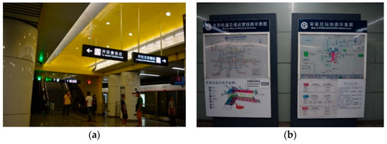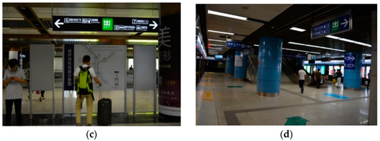 The platform serves pedestrians of boarding and alighting. Passengers’ information needs are mainly for outbound guidance and transfer guidance. Sufficient and eye-catching signs should be provided due to the large passenger flow of people. The contents of guiding signs mainly include the information of the direction, station name, exit guidance, stair guidance, elevator guidance, and time. At the platform area, information such as ride, transfer, and exit are recommended to use suspended and grounded signs, as shown in Figure 11a. A tube map should be set in the middle and both ends of the platform to facilitate pedestrians to travel (see in Figure 11b). Also, composite settings of guiding signs with suspension type and standing type (see in Figure 11c), and suspension type and ground type (see in Figure 11d) can also be used.