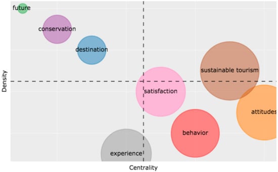 Finally, the lower-right quadrant shows the themes that are basic and transversal. These themes concern general topics transversal to the different research areas of the field. In this area, the appearing themes are behavior, satisfaction, and attitudes. While the terms behavior and attitudes are used as synonyms, an attitude refers to sustainable conducts enacted by an offer side, demand side, local community, and policy makers; the theme of satisfaction is connected with behavioral intentions, protected areas, and destination image. For sure, the bibliometric analysis shows that the theme of satisfaction is strongly connected with the term experiences since satisfaction is determined by the tourist experience made by authenticity, contact with local community, genuine and local food, etc. [94,95].