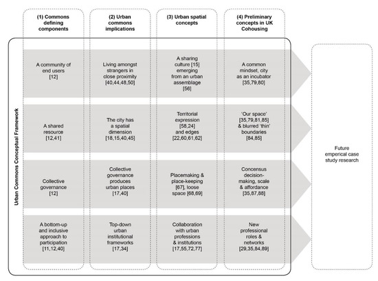 In pursuit of bridging this gap, the current paper will focus on addressing the need for a spatial understanding of commons in the context of urban residential landscapes by developing a new conceptual framework for urban commons that strengthens the connection between the emerging concept and spatial theory. To achieve this, a review approach will draw upon and organise existing commons and urban spatial concepts to build a preliminary conceptual framework within the context of recent UK cohousing research. The purpose of this preliminary conceptual framework is to lay the theoretical groundwork for future empirical research on urban commons specific to residential landscapes and substantiate more broadly the spatial theory surrounding urban commons. In the process of bridging spatial and urban design theory with urban commons, attention is also brought to the role of the design professions and how professional input can be accommodated within the community-led process of urban commoning.